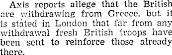 Axis reports allege that the British are withdrawing from Greece, but it is stated in London that far from any withdrawal fresh British troops have been sent to reinforce those already there.