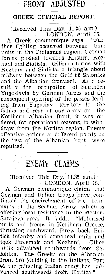FRONT ADJUSTED GREEK OFFICIAL REPORT. (Received This Day. 11.35 a.m.) LONDON, April 15. A Greek communique says: ‘'Further fighting occurred between tank units in the Ptolemais region. German forces pushed towards Klisura, Kozhani and Siatista. (Klisura forms, with Kozhani and Siatista, a triangle about midway between the Gulf of Salonika and the Albanian frontier). As a result of the occupation of Southern Yugoslavia by German forces and the consequent opening of the passes leading from Yugoslav territory to the flanks and rear of our army on the Northern Albanian front, it was ordered, for operational reasons, to withdraw from the Koritza region. Enemy offensive actions at different points on the rest of the Albanian front were repulsed. ENEMY CLAIMS (Received This Day. 11.35 a.m.) LONDON, April 15. A German communique claims that German and Italian troops have continued the encirclement of" the remnants of the Serbian Army, which is offering local resistance in the MestarSarajev.o area. It adds: “Motorised units and troops in Northern Greece, thrusting southward, threw back British infantry and armoured units and took Ptolemais and Kozhani. Other units advanced southwards from Salonika. The Greeks on the Albanian front are yielding to the Italians. Part of the pursuing Italian army has advanced southwards froth Koritza.”