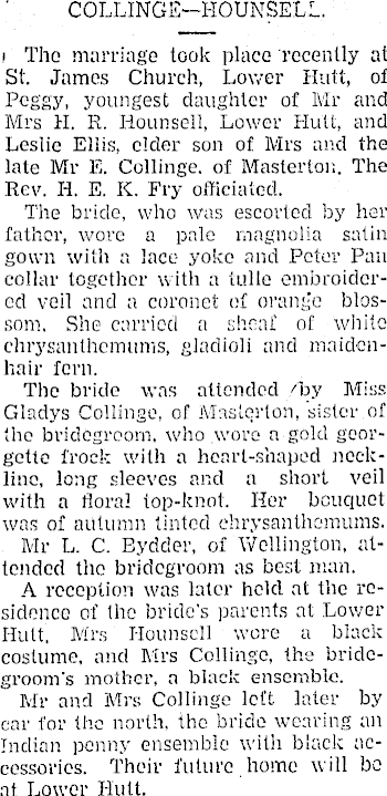 COLLINGS—HOUNSE L L. i The marriage took place recently at St. James Church, Lower Hutt, of Peggy, youngest daughter of Mr and Mrs H. R. Hounsell, Lower Hutt, and Leslie Ellis, elder son of Mrs and the late Mr E. Collinge. of Masterton. The Rev. H. E. K. Fry officiated. The bride, who was escorted by her father, wore a pale magnolia satin gown with a lace yoke and Peter Pau collar together with a tulle embroidered veil and a coronet of orange blossom. She carried a sheaf of white chrysanthemums, gladioli and maidenhair fern. The bride was attended /by Miss Gladys Collinge, of Masterton, sister of the bridegroom, who wore a gold georgette frock with a heart-shaped neckline. long sleeves and a short veil with a floral top-knot. Her bouquet was of autumn tinted chrysanthemums. Mr L. C. Eydder, of Wellington, attended the bridegroom as best man. A reception was later held at the residence of the bride's parents at Lower Hutt, Mrs Hounsell wore a black costume, and Mrs Collinge, the bridegroom's mother, a black ensemble. Mr and Mrs Collinge loft later by car for the north, the bride wearing an Indian penny ensemble with black accessories. Their future home will bo at Lower Hutt.