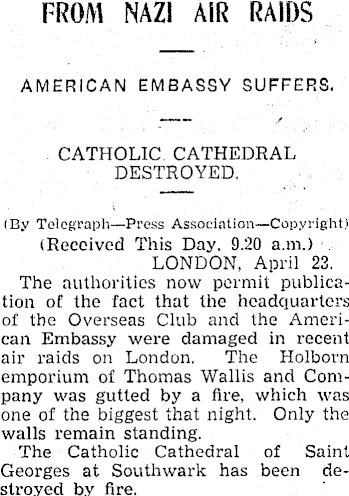 FROM NAZI AIR RAIDS AMERICAN EMBASSY SUFFERS. CATHOLIC CATHEDRAL DESTROYED. (By Telegraph—Press Association—Copyright) (Received This Day. 9.20 a.m.) LONDON, April 23. The authorities now permit publication of the fact that the headquarters of the Overseas Club and the American Embassy were damaged in recent air raids on London. The Holborn emporium of Thomas Wallis and Company was gutted by a fire, which was one of the biggest that night. Only the walls remain standing. The Catholic Cathedral of Saint Georges at Southwark has been destroyed by fire.