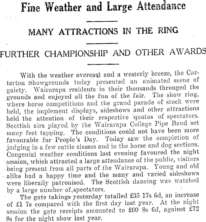 Fine Weather and Large Attendance MANY ATTRACTIONS IN THE RING FURTHER CHAMPIONSHIP AND OTHER AWARDS With the weather overcast and a westerly breeze, the C<nterton (Showgrounds today presented an animated scene o. gaiety. Wairarapa residents in their thousands thronged the grounds and enjoyed all the fun of the fair. The show ling, where horse competitions and the grand parade of stock weie held, the implement displays, sideshows and other attractions held the attention of their respective quotas of spectatois. Scottish airs played by the Wairarapa College Pipe Band set many feet tapping. The conditions could not have been moie favourable for People’s Day. Today saw the completion o judging in a few cattle classes and in the horse and dog sections. Congenial weather conditions last evening favoured the night session, which attracted a large attendance of the public, visitois being present from all parts of the Wairarapa. 1 oung and old • alike had a happv time and the many and varied sideshows were liberally patronised. The Scottish dancing was watched by a large number of\spectators. The gate takings yesterday totalled £35 1/s 6d, an increase of £1 7s compared with the first day last year. At the night session the gate receipts amounted to £6O 8s 6d, against £72 8s for the night show last year.