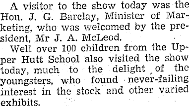 A visitor to the show today was the Hon. J. G. Barclay, Minister of Marketing, who was welcomed by the president, Mr J. A. McLeod. Well over 100 children from the Upper Hutt School also visited the show today, much to the delight of . the youngsters, who found never-failing interest in the stock and other varied exhibits.