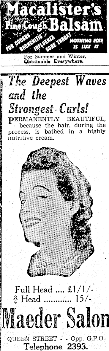 For Summer and Winter. Obtainable Everywhere. I The Deepest Waves and the Strongest ■ Curls! PERMANENTLY BEAUTIFUL, because the hair, during the process, is bathed in a highly nutritive cream. I A- WzJK RfslL ■ I Full Head .... £l/1/--4-Head 15/Maeder Salon QUEEN STREET - - Opp. G.P.O. | Telephone 2393.