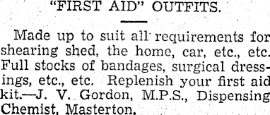 “FIRST AID” OUTFITS. Made up to suit air requirements for shearing shed, the home, car, etc., etc. Full stocks of bandages, surgical dressings, etc., etc. Replenish your first aid kit—J. V. Gordon, M.P.S., Dispensing Chemist, Masterton.