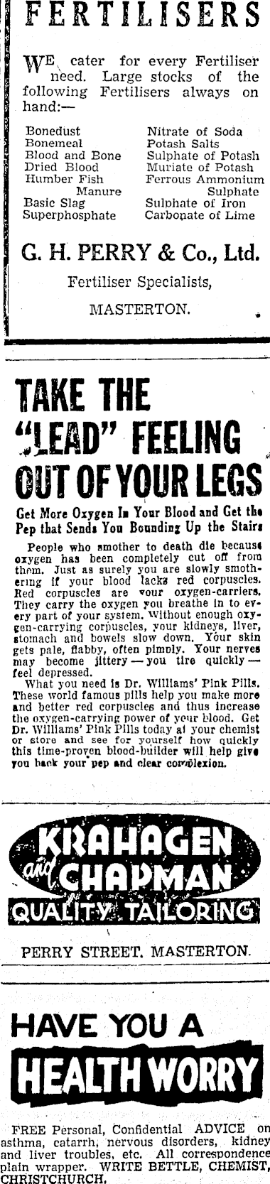 FERTILISERS w E cater for every Fertiliser j | need. Large stocks of the following Fertilisers always on hand: — Bonedust Nitrate of Soda Bonemeal Potash Salts ! Blood and Bone Sulphate of Potash Dried Blood Muriate of Potash Humber Fish Ferrous Ammonium Manure Sulphate Basic Slag Sulphate of Iron Superphosphate Carbonate of Lime I G. H. PERRY & Co., Ltd. ( Fertiliser Specialists, MASTERTON. TAKE THE “LEAD” FEELING GUT OF YOUR LEGS Get More Oxygen In Your Blood and Get the Pep that Sends You Bounding Up the Stairs People who smother to death die because oxygen has been completely cut off from them. Just as surely you are slowly smothering if your blood lacks red corpuscles. Red corpuscles are vour oxygen-carrlers. They carry the oxygen you breathe in to every part of your system, without enough oxy-gen-carrying corpuscles, your kidneys, liver, stomach and bowels slow down. Your skin gets pale, flabby, often plmoly. Your nerves may become jittery —you tire quickly — feel depressed. What you need is Dr. Williams' Pink Pills. These world famous pills help you make more and better red corpuscles and thus increase the oxygen-carrying power of your blood. Get Dr. Williams’ Pink Pills today al your chemist or store and see for yourself how quickly this time-proven blood-builder will help glvt you bank your’pep and clear complexion. ! hi WO JW-i * PERRY STREET. MASTERTON. HAVE YOU A _ FREE Personal, Confidential ADVICE on asthma, catarrh, nervous disorders, kidney and liver troubles, etc. All correspondence plain wrapper. WRITE BETTLE, CHEMIST, CHRISTCHURCH.