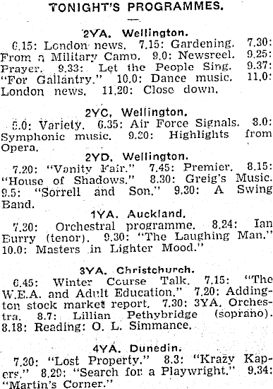 TONIGHT’S PROGRAMMES. aVA. Wellington. C 15: London news. 7.15: Gardening. 7.30: From a Military Camo. 9.0: Newsreel. 9.25: Prayer. 9 33: Let the People Sing. 9.37: ‘‘For Gallantry.” 10.0: Dance music. 11.0: London news. 11.20: Close down. 2YC, Wellington. 5.0: Variety. 6.35: Air Force Signals. 8.0: Symphonic music. 9.20: Highlights from Opera. 2YD. Wellington. 7.20: “Vanitv Fair.” 7.45: Premier. 8.15: “House of Shadows.” 8.30: Greig’s Music. 9.5: “Sorrell and Son.” 9.30: A Swing Band. IYA. Auckland. 7 20: Orchestral programme. 8.24: lan Eurry (tenor). 9.30: “The Laughing Man.” 10.0: Masters in Lighter Mood.” 3YA. Christchurch. 6.45: Winter Course Talk. 7.15: “The W.E.A. and Adult Education.” 7.20: Addington stock market report. 7.30: 3YA. Orchestra 8.7: Lillian Pethvbridge (soprano). 8.18: Reading: O. L. Simmance. 4YA. Dunedin. 7 SO - “Lost Propertv.” 8.3: “Krazy Kapers.” 8.29: “Search for. a Playwright.” 9.34: “Martin’s Corner.”