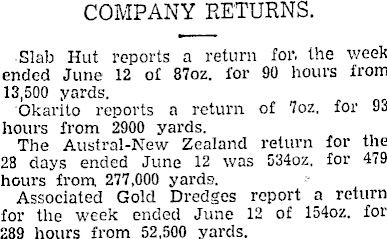 COMPANY RETURNS. Slab Hut reports a return for. the week ended June 12 of 87oz. for 90 hours from 13,500 yards. Okarito reports a return of 7oz. for 93 hours from 2900 yards. The Austral-New Zealand return for the 28 days ended June 12 was 5340 z. for 479 hours from 277,000 yards. Associated Gold Dredges report a return for the week ended June 12 of 1540 z. for 289 hours from 52,500 yards.