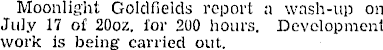 Moonlight Goldfields report a wash-up on July 17 of 20oz. for 200 hours. Development work is being carried out.