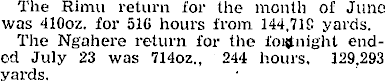 The Rimu return for the month of June was 410 oz. for 516 hours from 144,719 yards. The Ngahere return for the foijfnight ended July 23 was 7140 z., 244 hours. 129,293 yards.