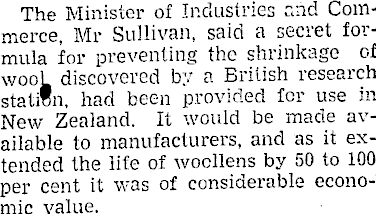 The Minister of Industries and Commerce, Mr Sullivan, said a secret formula for preventing the shrinkage of wooL discovered by a British research station. had been provided for use in New Zealand. It would be made available to manufacturers, and as it extended the life of woollens by 50 to 100 per cent it was of considerable economic value.