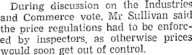 During discussion on the Industries and Commerce vote, Mr Sullivan said the price regulations had to be enforced by inspectors, as otherwise prices would soon get out of control.