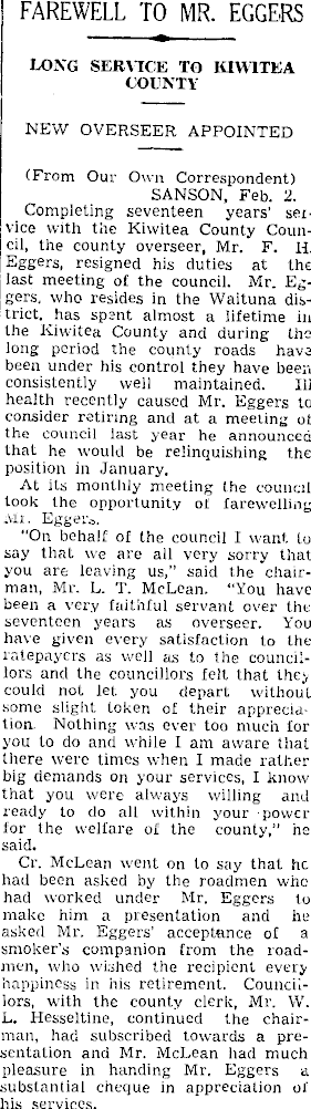 FAREWELL TO MR. EGGERS LONG SERVICE TO KIWITEA COUNTY NEW OVERSEER APPOINTED (From Our Own Correspondent) SANSON, Feb. 2. Completing seventeen years’ seivice with the Kiwitea County Council, the county overseer, Mr. F. H. Eggers, resigned his duties at the last meeting of the council. Mr. Eggers. who resides in the Waituna disI trict, has spent almost a lifetime in the Kiwitea County and during the long period the county roads have been under his control they have been consistently well maintained. Hi health recently caused Mr. Eggers to consider retiring and at a meeuing ot the council last year he announced that he would be relinquishing the position in January. At its monthly meeting (he council Look the opportunity of farewelling Mi. Egger.-,. “On behalf of the council I want to say that we are all very sorry that you are leaving us,” said the chairman, Mr. L. T. McLean. “You have been a very faithful servant over the seventeen years as overseer. You have given every satisfaction to the ratepayers as well as to the councillors and the councillors felt that thc> could not let. you depart without some slight token of their appreciation. Nothing was ever too much for you to do and while I am aware that there were times when I made rather big demands on your services, I know that you were always willing and ready to do all within your power lor the welfare of the county,” he said. Cr. McLean went on to say that he had been asked by the roadmen who had worked under Mr. Eggers to make him a presentation and he asked Mr. Eggers’ acceptance of a smoker’s companion from the roadmen, who wished the recipient every happiness in his retirement. Councillors, with the county clerk, Mr. W. L. Hesseltine, continued the chairman, had subscribed towards a presentation and Mr. McLean had much pleasure in handing Mr. Eggers a substantial cheque in appreciation of his services.