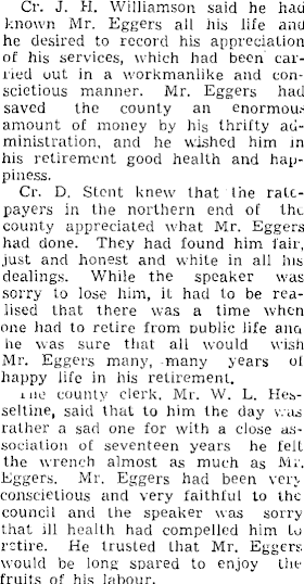 Cr. J. H. Williamson said he had known Mr. Eggers all his life and he desired to record his appreciation of his services, which had been earned out in a workmanlike and conscietious manner. Mr. Eggers had saved the county an enormous amount of money by his thrifty administration, and he wished him in his retirement good health and happiness. Cr. D. Stent knew that the ratepayers in the northern end of the county appreciated what Mr. Eggers had done. They had found him fair, just and honest and white in all his dealings. While the speaker was sorry to lose him, it had to be realised that there was a time when one had to retire from oublic life ano he was sure that all would wish Mr. Eggers many, many years of happy life in his retirement. me county clerk. Mr. W. L. Hesseltine, said that to him the day was rather a sad one for with a close association of seventeen years he felt the wrench almost as much as Mr. Eggers. Mr. Eggers had been very conscietious and very faithful to the council and the speaker was sorry that ill health had compelled him to retire. He trusted that Mr. Eggers would be long spared to enjoy the fruits of his labour.