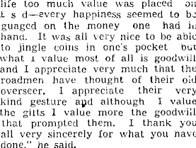 life too much value was placed on £ s d —every happiness seemed to be guaged on the money one had in hand. It was all very nice to be able to jingle coins in one's pocket but what i value most of all is goodwill and I appreciate very much that the roadmen have thought of their old overseer. I appreciate their very .kind gesture apd although I value the gifts I value more the goodwill that prompted them. I thank you all very sincerely for what you nave done,” he said.