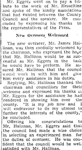 Mr. Eggers went, on to pay a tribute to the work of Mr. Hesseltine and spoke of the kindly that had existed between the County Council and the speaker. He concluded by expressing his thanks to the representatives of the Press. New Overseer Welcomed The new overseer, Mr. James Hallinan, was then cordially welcomed by the chairman, who expressed the hope that Mr. Hallinan would be as successful as Mr. Eggers in the task he would have to perform. He assured Mr. Hallinan that the council would work in with him and give him every assistance in his duties. Replying, Mr. Hallinan thanked the chairman and councillors for their i welcome and expressed his thanks i.G I Mr. Eggers for the assistance he had | rendered in showing him over the • county. “It is my job now and 1 . will endeavour to do my utmost to further the interests of the county,” he concluded. Offering his congratulations to • Mr. Hallinan, Mr. Eggers said that the council had made a wise choice in selecting an experienced man for jthe duties of overseer. He was confident that the council would be well satisfied with Mr. Hallinan.