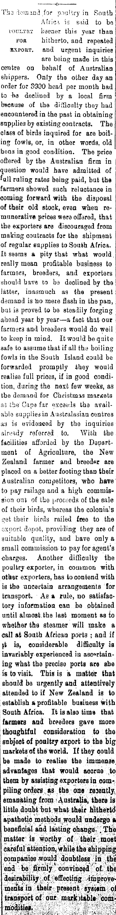 0 Tb. 3 :lom3Gi.l,for p.iultry in South Africa is said to bo voui/trt keener this year than for hitherto, and repeated kxpobt. and urgenl; inquiriee are being made in this centre on behalf of Australian shippers. Only the other day an order for 3000 head per month had to declined by a local firm because of the difficulty they had encountered in the past in obtaining supplies by existing con tracts. The class of birds inquired for are boiling fowls, or, in other words, old hens in good condition. The price oftered by the Australian firm in question would have admitted of full ruling rates being paid, but the farmers showed such reluctance in coming forward with the disposal of their old stock, even when remunerative prices were offered, that the exporters are discouraged from making ooufcracts for the shipment of regular supplies to South Africa. It seams a pity that what would, really mean profitable business to farmers, breeders, and exporters should have to ba declined by the latter, inasmuch as the present demand is no meie flash in the pan, but is proved to be steadily forging ahead yaar by year—a fact that our farmers and breeders would do we'll to keep in mind. It would be quite safe to assume that if all tha boiling fowb in the South Island could be forwarded promptly they would realise full prices, if in good condition, during the nexfc few weeks, as the demand for Christmas markets as the Cape far exceeds the available supplied in Australasian centres as is evidonced by the inquiries already referred to. With the facilities afforded by the Department of Agriculture, the New Zealand farmer and breeder are placed on a better footing than their Australian competitors, who have' to pay railage and a high commission out of the proceeds of the sale of their birds, whereas the colonials get their birds railed free to the export depot, providing they are of suitable quality, and have only a [ small commission, to pay for agent's •charges. Another difficulty the poultry exporter, in common with ) other exporters, has to contend with is the uncertain arrangements for transport. As a rule, no satisfactory information can be obtained until almost, the last moment as to whether the steamer will make a call at South African ports ; and if ft is, considerable difficulty is invariably experienced in ascertaining what the precise ports are she is to visit. This is a matter that should be urgently and attentively attended to if New Zealand is to establish a profitable business with South Africa. It is also time that farmers and breeders gave more thoughtful consideration to the subject of poultry export to the big markets of the world. If they could be made to realise the immense, advantages that would accrue to them by assisting exporters in compiling orders as the one re3ently ; emanating from Australia, there is little doubt but -what their hitherto* apathetio methods would undergo a beneficial and lasting change.. The matter is worthy of their most careful attention, while the shipping companies would doubtless in the end be firmly convinced of the desirability of; effecting -improve* ments in their present syaqem < of transport of our marketable com- - moditiea. ~'''<,' "*' < '■'..