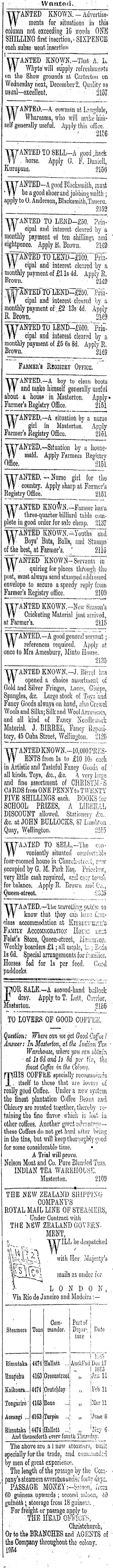 Wanted.. WANTED KNOWN. - Advertisements for situation!! in this column not exceeding 16 words OMS SHILLING first insertion, ■ SIXPENCE each subse uont inssi'tJim Wanted -known.—That. a. l. YV Whyte' will supply refreshments on the Show grounds at Carterton on Wednesday next, December 2. Quality as usual—excellent. 2157 ANTED—A cowman at Liuigdale, , . Whareama, who will make himself generally useful. Apply this office. ' 2156 WANTED TO SELL—A good Jiack . horse. Apply G.."F. Daniell, Kurupuni. 2150 WANTED— A good Blacksmith, must be a good shoerand jobbing smith; apply to 0. Anderson, Blacksmith,Taueru, 2152 WANTED TO LEND—£SO. Principal and interest cleared by a monthly payment oi ten shilling! and eightpence. Apply K. Brown, 2149 eipal and interest cleared by a monthly payment, of £1 Is 'id. Apply S. Brown, 2149 ¥~ANTEDTOTEND-£2s()ri?ra-cipal and interest cleared by a monthly payment of .£2 13s4d. Apply R. Brown, 2149 MED TTMND-£oOa'Prin-cipal and interest cleared by a monthly payment of £5 6s Bd. Apply R. Brown. 2148 Farmer's Registry Office. WANTED.— A boy to clean boots and make himself generally useful about a house'in Masterton. Apply* Farmer's Registry Office. 2151 WANTED.— A situation by a nurse girl in Masterton. Apply Farmer's Registry Office. 2161 WANTED. —Situation by a housemaid. Apply Farmers Registrv Office. 215*1 WANTED. --.Nurse girl for tlio country/Apply sharp at Farmer's Registry Office, 2151 WANTED TOVN.-F armer lias's, three-quarter billiard table complete in good order for sale cheap, 2137 TiTANTED KNOWN.—Youths' and YV Boys' Bats, Balls, and Stumps' of the best, at Farmer's, ' 2115 W~~ ANTED KNOWN-Servants in quiring for places through the post, must always send stamped addressed envelope to secure a speedy reply from Farmer's Registry office. 2109 WANTED KNOWN.-Nov,- Season's Cricketing Material just arrived, at Farmer' 3. 2115 WANTED.— A good general servant; • references required. Apply at once to Mrs Amesbury, Minto House, 2135 TSTANTED KNOWN.-J. Bin -! has YV opened a choice assortment of Gold and Silver Fringes, Laces, Gimps, ngles, &c. Large stock of Toys'and Fancy Goods always on hand, also Crewel Wools and Silks; Silk and Wool Arrasenes, and all kind of Fancy Needlework Material, J, BIRREL, Fancy Repository, 45 Cuba Street, Wellington. "2125 WANTED KNOWN.-10.000PRES-ENTS from Is to £lo 10s each in Artistic and Tasteful Fancy Goods of all kinds. Toys, &c., &c, A. very large and fine assortment of CHRISTJf/3 04 RDS from ONE PENNYto T WENTY FIVE SHILLINGS each. BOOKS for SCHOOL PRIZES. A LIBERAL DISCOUNT allowed. Stationery &c.. &c, at JOHN BULLOCKS, 87 Lainbton Quay, Wellington. 21c5' A A TED TO SELL.—The conveniently Bituatetf coum>ri':.!)l3 four-roomed house in •Cliureh-strcot, row occupied by G, M, Park Esq. Price lew, very little cash required, and easy teniis for balance; .Apply R. Brown and Co,, Queen-street. • £035 WAi\TED.— 'lliu wavolJuig.public to know that tjioy can Jiavo fi-sc-olass accommodation at KiEßißVEim's Family AccommoD4Tio.v Hou : je r.e::t Feist's Stow, Queen-street, Mascarton. Weokly boarders £1; all meals, 1;;: Beds Is Cd. Special arrangements for families. Horses fed for Is per feed. Goal paddocks. TIOR SALE.-A second-hand bullock P dray. Apply, to T. Lett, Carrier, Masterton. 2165 TO LOVERS OF GOOD COFFIiIT Quotum; Where am m jet Good Coffee t Answer; In Masterton, at the Indian Tee, Warehmtse, where you cm abtah ■ at ls Sdandh Sd pw fif,, tk finest Coffee in the Colony. mflis COFFEE specially rccomnißjids X- itself to those that are lovers of really good Coffee. ■ Under a new system the finest plantation Coffee Beans and Chicory are roasted together, thereby re-taining-the fine flavor which is lost in other coffees. Another great advanfrw—these Coffees do not get hard after being in the tins, but will keepthorqugWy-good for some considerable time. • A Trial will provo. Nelson Moat and Co, Pure Blended Teas, INDIAN TEA WAREHOUSE, Masterton. 2109 THE NEW ZEALAND SHIPPING COMPANY'S ROYAL MAIL LINE OF STEAMERS, Under Contract witii THE NEW ZEALAND GOVERNMENT, ?, TT7ILL be despatched YV. ' ®" or - Ma j esfc y' 3 lUll-C ® \ mails as under for LONDON, Via Riode Janeiro and Madeira : Commandor. Port of | Dcpar-. j Date tare Tons Steamors Hftliatt Rimutaka 4474 4163 Groonstreot Jar. 1-1 Orutcbloy Feb U 4474 4103 Bono iJlar 11 4163 rurprn /uuc 0 Hallctt 4474 Tongariro' Aorangi .., Biinutaka . And thenceforth everv fourth Thursday. The above arc a 1 new steamers, built specially for the trade, and commanded by men of great experience. The length of the passago by the Company's steamers averages under fortv days, PASSAGE MONEVi-Snioon; frcia CO guineas upwards; second saloon, 40 gulheAbsteerage from 18 guinea.. For freight or passage applv to THE HEAD OFV.'CI>, ; Christchurch, Or to the BRANCHES and AGENTS of the Company throughout the colony. 1954