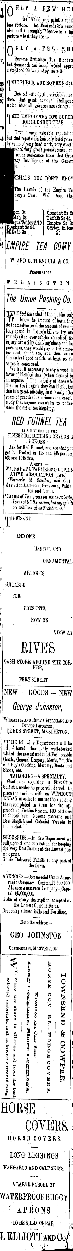 w, 128 !89 181 '.97 !70 145 NL Y A FE W ME * QNI, Y A PE W ME J • ■ 'he"jFo'fld. onri paint a rcalli fine Picture. But.tlioiisautls can recog thoroughly" appreciate a fini picture whefl.they aee it. 0 ?ocome lirat.ijlass Tea Blendere but thousands can appro oiat'e. Good tea Vrhen they taste it, rjIHE PjJBLIC ARE NOT EXPKIITi But cullectively there exists amonj them that great average iritelligenci which, after ell, governs most things, fPSE EMPIUKTKACO'S 80PER--1 .lUR BLENDED TEAB ; Have a very valuable reputation but that reputation has only Tieiiti gainec by years of very hard work, verycarefu —Htion,' very great,pe^aeveranoe,anc much Assistance from that Ureal rage Intelligence of the Genera ic. MAPS YOU DON'T KNOW [The Brands of the Empire Tet 'a Teas, Weil, here thej ith lili ac E 1 jon 3s M3s ' . ant 2a 84 Mitado 2s Orescent 2s 6d Buffalo 2s 4d. Empire 2s 2d Osyloa, ia lead EMPIRE TEk GOUir, w. AND G.TURMJLL& CO., Pbopbibtors, WELLINGTON. The Union Packing Co. WE fss! sure tkat if the publio only knew the amount of harm they do themselves, and the amount of money they spend in doctor's bills to try and remedy (if it ever can to remedied) the injury caused by drinking oheap and impure leaß, thoy would pay a little more for good, sound tea, and thus insure themselves good health, at least eo far aa tea is concerned. We feel it necessary to Bay a word in favor of blended teas (when blended by an expert). ' Ttho majority of those who doal in tea imagine they ban blend, but this is a great mistake, as it iaorily after years of practical expsrienoo and careful study that anyone can claim to under staod the art of tea blending, RED FUMEL TEH 18 A MIXTUKB OF THE FINEST DAHJEELINU OEKLON & PEKOES Ask for Red Funnel, and see that you get it. Packed in lib and Alb racketa, 51b and 101b tins. ' •Aoma:— WAIRARiPA FARMERS' C< i-OPEit-ATIYE' A SSOOI AT r 9N, [LTD.] (Formtrly M, Casdhrg and Co.) Muterton,Caiterlon,Groytown, Pahia tua and Tenui. ' The use of Tea grows on me anmingly, Icanmt tell tht reason, but my spirits ore exhilarated asifmihmie.' f JIUOUSAND AND ONE USEB'CL AND ORNAMENTAL ARTICLES SUITABLE FOR PRESENTS, NOW ON VIEW AT RIVE'S OASH STORE AROUND THE COR. NER, PERY-STREET new:- goods - NEW Georqe Johnston, Wholesale and Retail Mebohantand Direct Impobieb, QUEEN-STREET, MASTERTON, THE following Departments will be ••' found thoroughly well-stocked Goods, General Drapeiy, Men's, Youth's and Boy's Clothing, Mercery, Boots and Shoes, eto. TAILORING—A SPECIALTY. Gentlemen requiring a First Class Suit at a moderate price will do well to place their ordora with us WITHOUT DSLA Y in ordev to ensure their getting them completed ' in time for tho approaching Featine Season. 800 patterns to choose from, Newest patterns, and Best English and Colonial Tweeeis in the market. GROCERIES.—In this Department we still uphold onr reputation for keeping the very Best Brands at the Lowest posGoods Delivered FREE to any part of the Town, AGENClES.—Commercial Union Assurance Company-Capital,^,s(Jo,ooo, Alliance Assuraneo Company- Caoital, £6,000,000, Hiiks of oYery description accepted at the Lowest Current Kates. Note the address— GEO. JOHNSTON QunN-staiicr, MASTERTON t H O. 0 £ * H I? 01 0 i W 0 § ■ a ® S 5 0 r* I'M '<j CO 0 ' B 0" 3 o ft |S '5 0 W • i ® fc . S IB M 1 » 6 ®P 1 H 5 1 '0 | o. o » 101 W t " n M CO it p 3 o ? § § It 3 8 W COVERS. HORSE 00 YERS. LONG LEGGINGS KANGAROO AND CALFSKINS, a parcel of WATERPROOFBUGGY APRONS •TO BE SOLD OHEAP, J. ELLIOTT m Co/ ii— ' ] i \ h A a A L 1 'J. H Q