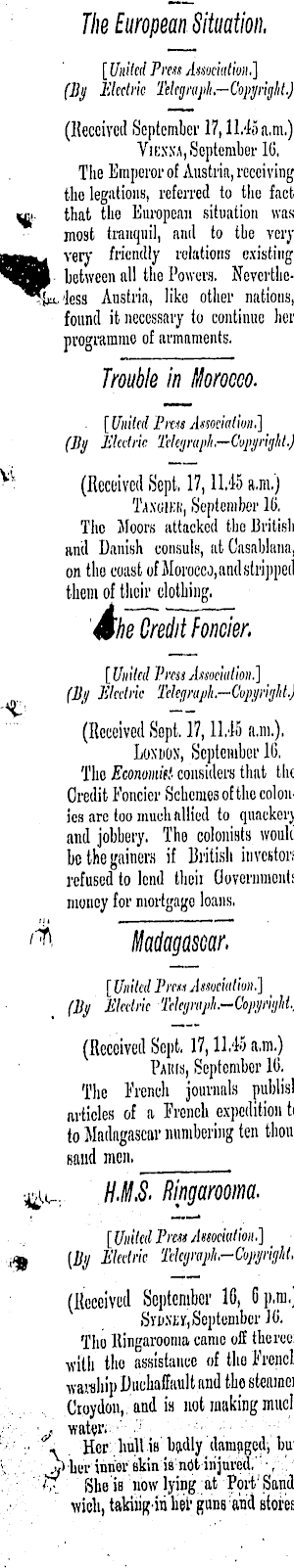 The European Situation. [United Press Association.] (By Electric Telegraph,—Copyright.) (deceived September 17,11.45 a.m.) Viexka, September IG, The Emperor of Austria, receiving the legations, referred to the fact that the European situation was most tranquil, and to the very veiy friendly relations existing between all the Powers. Neverthe'less Austria, like other nations, found it necessary to continue her programme of armaments. Trouble in Morocco. ■ [ United Press Association,] (By Electric Telegraph.—Copyright.) (Received Sept, 17,11.45 a,m.) Ta.wii'K, September 10. The Moors attacked the British and Danish consuls, atCasablana, on the coast of Morocco, and stripped them of their clothing, dhe Credit Fonder. [ United Press Association.] (By Electric Telegraph—Copyright.) (Received Sept. 17,11.45 a.m.). Loxuox, September 16, Tho Economic considers that the Credit Fonder Schemes of the colonies are too much allied to quackery and jobbery. The colonists would be the gainers if British investors refused to lend their Governments money for mortgago loans. Madagascar, [ United Press Association.] _ (By Electric-Telegraph.—Copyright.) (Received Sept. 17,11.45 a.m.) Pakis, September 10, The French journals publish articles of a French expedition tc to Madagascar numbering ten thousand men, H.M.S. Ringaroom. [United Press Association.] _ [B;/ Electric Telegraph-Copyright,) (Received September 10, C p.m.) Svdxh, September JC. Tho Hingarooma came off thereof with tho assistance of tho French warship Duchaffault and tho steamer Croydon, , and is not making much •• :■ '"i. Her ;lmU is badly damaged, but X.V. 'her inner akinia'nOt injured,' •, '•"# She iB now lying at Port Sandwich, takiiig in het- guns and stores