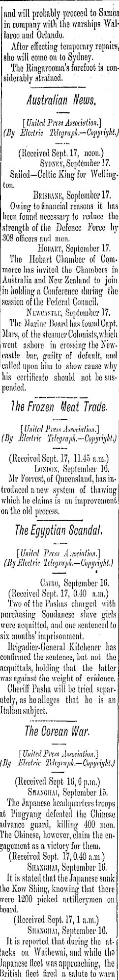 • and will probably proceed to Samba in company with the warships Wali laroo and Orlando, • Aftor effecting temporary ropaira, , she will come on to Sydney, • Tlio Ringarooma's forefoot is con- • siderably strained, > Australian News, [ United Press Association.] (By Electric Telegraph—Copyright.) (Received Sept, 17, noon.) Sydxkv, September 17, Sailed—Celtic King for Wellington. Bkisiiank, September 17. Owing to financial reasons it has been found necessary to rcdnco the strength of the Defence I'orce liy 308 officers and men. Hoiiaht, September 17. The Hobart Chamber of Commerce has invited the Chambers in Australia and New Zealand to join in holding a Conference during tlio session of the Federal Council, Nkwuasti.i:, September 17. The Marine Hoard has found Capt. Mars, of the steamer Colonists,which went ashore in crossing the Newcastle bar, guilty of default, and called upon liiiu to show cause why his certificate should not be suspended. He Frozen Meat Trade. [ United Press Association.] (By Electric Telegraph—Copyright.) (Received Sept. 17, 11.45 a.m.) Loxnox, September 16, Mr Forrest, of Queensland, has introduced a new system of thawing which he claims is an improvement on tlio old process. The Egyptian Scandal. [United Press A.iociation.] (By Electric letegraph.—Copyright.) Cairo, September 16. (Received Sept. 17, 0.40 a.m.) Two of the Pashas charged with purchasing Soudanese slave girls were acquitted, and one sentenced to six months' imprisonment. Brigadier-General Kitchener has confirmed the sentence, but not the acquittals, holding that the latter was against Hie weight of evidence. Gheriff Pasha will be tried separately, as ho alleges that he is an Italian subject, The Oorean War. [ United Press Association.] (By Electric Telegraph— Copyright.) . (Received Sept 16, C p.m.) Shanghai, September 15. The Japanese headquarters troops j at Pingyang defeated the Chinese advanco guard, killing 400 men. ; The Chinese, however, claim the engagement as a victory for them, (Received Sept, 17,0.40 a.m.) Shanghai, September 16, It is stated that the Japanese sunk the Kow Siting, knowing that there were 1200 picked artillerymen on hoard, (Received Sept, 17,1 a.m.) Siiaxohai, September 16. It is reported that during the attacks on Waihewai, niul while tlio J Japanese fleet was approaching, the British fleet fired a salute to warn