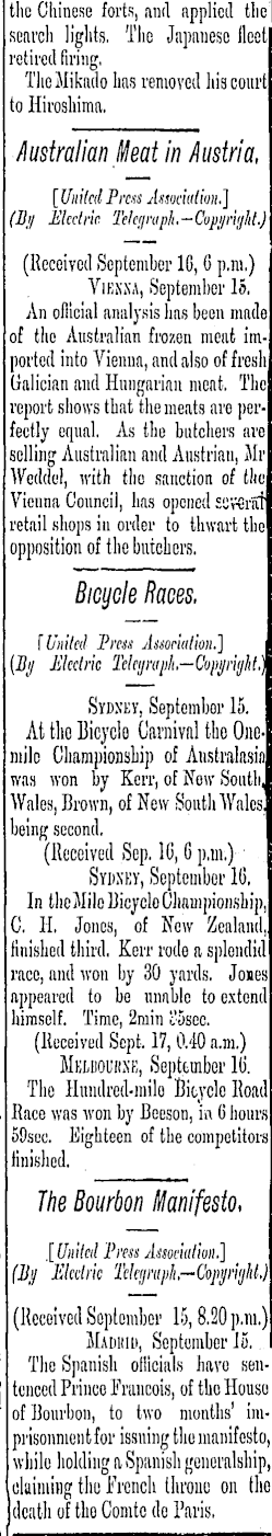 i the Chinese forts, and applied the] search lights. The Japanese fleet retired firing, The Mikado has removed his court to Hiroshima. Australian Meat in Austria, ■ [ United Press Association.] , (By Electric Telegraph.—Copyright.) | (Received September IG, 0 p.m.) ' Viensa, September 15. I An ollicial analysis has been made of the Australian frozen meat imported into Vienna, and also of fresh Ualician and Hungarian meat. The report shows that the meats are perfectly equal. As the butchers are soiling Australian and Austrian, Mr Weddel, with the sanction of the Vienna Council, has opened ss'ffirat retail shops in order to thwart the ' opposition of the butchers. ; Bicycle Races. ' \ United Press Association.] ' (By Electric Telegraph—Copyright,) Sydney, September 15. At tlio Uicyclo Carnival the Onemile Championship of Australasia was won by Kerr, of Now South, Wales, Brown, of New South Wales being second. , (Received Sep. IC, 6 p.m.) Sydxky, September IG, I In tlicMilo Uicyclo Championship, C. 11, Jones, of New Zealand, , finished third. Kerr rode a splendid [ race, and won by 30 yards. Jones , appeared to be unable to extend . himself. Time, 2min i!ssec. . (Received Sept. 17,0.40 a.m.) 1 Muuoukxh, September 10. The Hundred-milo Bicycle Road f Race was won by Beeson, in 6 hours 59sec. Eighteen of the competitors finished. The Bourbon Manifesto, ) .[ United Press Association.] (By Electric Telegraph,—Copyright,) (Received September 15,8.20 p.m.) Madrid, September 15. The Spanish officials havo sen- | tenccd Prince Francois, of tbo House of Bourbon, to two months' imprisonment for issuing the manifesto, while holding a Spanish generalship, claiming the French throne on tlio dcatli of the Comtc de Paris. I i !