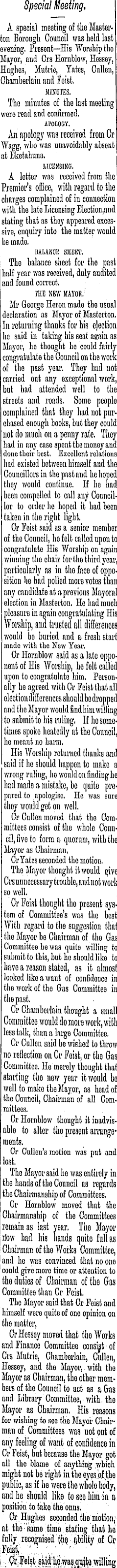 Special Meeting, A special meeting of the Masterton Borough Council was held last evening. Present—His Worship the Mayor, and Crs Hornblow, Hessey, Hughes, Mutrie, Yates, Cullen, Chamberlain and Feist. MINUTES. Tho minutes of the last meeting wero read and confirmed. APOLOGY. An apology was received from Or Wagg, who was unavoidably absent at Eketahuna, LICENSING. A letter was received from the Premier's oice, with regard to the charges complained of in connection with the late Licensing Election,and stating that as they appeared excessive, enquiry into the matter would be made. BALANCE SHEET, Tho balance sheet for the past half year was received, duly audited and found correct. THE NEW MAYOU.' Mr George Heron made the usual declaration as Mayor of Masterton, In returning thanks for his election he said in taking his seat again as Mayor, he thought he could fairly congratulate the Council on the work of tho past year. Thoy had not carried out any exceptional work, but had attended well to the streets and roads. Some people complained that they had not purchased enough books, but they could not do much on a penny rate. Thoy bad in any case spent the money and done their best, Excellent relations had existed between himself and the , Councillors in the past and he hoped ; they would continue. If be had i been compelled to call any Councili lor to order he hoped it had been taken in the right light, Cr Feist said as a senior member L of the Council, he felt called upon to ' congratulate His Worship on again winning the chair for the third year, • particularly as in the face of oppo--1 sition he had polled more votes than ' any candidate at a previous Mayoral election in Masterton, He had much ; pleasure in again congratulating His 1 Worship, and trusted all differences t would bo buried and a fresh start made -with, the New Year. Cr Hornblow said as a late oppo- | nent of His Worship, he felt called , upon to congratulate him. Person- . ally he agreed with Cr Feist that all ; oldctiondifferences shouldbedropped i and the Mayor would findhim willing i to submit to his ruling, If ho sometimes spoko heatedly at the Council, i be meant no harm, ' His Worship returned thanks and said if ho should happen to make a wrong ruling, ho would on finding he > had mado a mistake, ho quite preL pared to apologise, He was sure ' they would got on well, Cr Cullen moved that the Com- , mittees consist of the whole Couni oil, five to forma quorum, with the . Mayor as Chairman, Cr Yates seconded the motion, i The Mayor thought it would give i Crs unnecessoiy trouble, and not work ■ so well. i Or Feist thought tho present system of Committee's was the best • With regard to the suggestion that i the Mayor be Chairman of the Gas 1 Committee he was quite willing to submit to this, but he should like to » have a reason stated, as it almost 1 looked like a want of confidence in ' the work of the Gas Committee in ' the past. Cr Chamberlain thought a small 1 Committee would do more work, with i less talk, than a large Committee, i Cr Cullen said he wished to throw no reflection on Cr Feist, or the Gas [ Committee. He merely thought that | starting tho new year it would bo well to make the Mayor, as head of the Council, Chairman of all Committees. Cr Hornblow thought it inadvisable to alter the present arrange" ments. Cr Cullen's motion was put and lost. The Mayor said he was entirely in the hands of the Council as regards the Chairmanship of Committees. Cr Hornblow moved that the Chairmanship of the Committees remain as last year. The Mayor riow had his hands quite full as Chairman of tho Works Committee, and he was convinced that no one could give more time or attention to the duties of Chairman of the Gas Committee than Cr Feist. The Mayor said that Cr Feist and himself were quite of ono opinion on the matter, Cr Hessey moved that tho Works and Finance Committee consist of Crs Mutrie, Chamberlain, Cullen, Hessey, and the Mayor,, with the Mayor as Chairman, the other members of tho Council to act as a Gas and Library Committee, • with, the Mayor as Chairman, His reasons for wishing to see the Mayor Chairman of Committees was not out of any feeling of want of confidence in Cr Feist, but because the Mayor got all the blame of anything which might not be right in the eyes pi the public, as if he were tho whole body, and he should like to seo himiii a position to take the onus, Or, Hughes seconded the motion, at the'same time stating that he fully recognised th? ability of Cr Feipt,, .:,'..."'„''.' '"' ' . ■ss eis saidho vfilling