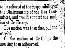 ;.■-■■ ■::■.■.-.-. wM to be relieved of the responsibility of .jM the Chairmanship of the Gas pom* 'm mittee, and would Bupport the ioa of Cr Hessey. ■' v : £*•; The motion was then then put and''}/; carried. ;• ;f ; On the motion of Cr Cullon the meeting then adjourned,