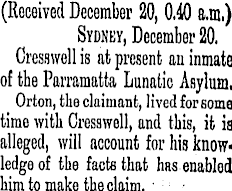 (Received December 20, 0.40 a.m,) Sydney, December 20. Cresswellis at present an inmate of the Parramatta Lunatic Asylum. Orton, the claimant, lived for soma time with Cresswell, and this, it is alleged, will account for his knowledge of the facts that has enabled him to make the claim. • •