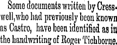 Some documents writton by Cress* I well.who had previously boon known as Castro, have boen identifiod as In the handwriting of Roger Tichborne.