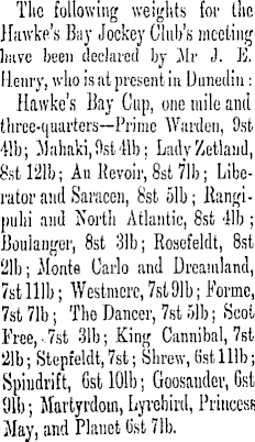 Tho following weights for the Hawke's Bay Jockey Club's meeting have been declared by Mr J. E, Henry, who is at present in Dunedin: Hawke's Bay Cup, one mile and three-quarters—Prime AVarden, 9st 41b;Mahaki,0st41b ; Lady Zetland, Bstl2lb; Au Revoir, Bst 71b; Liberator and Saracen, Bst alb; Rangipubi and North Atlantic, Bst 41b ; Boulanger, Bst 31b; Rosefeldt, Bst 21b; Monte Carlo and Dreamland, 7stlllb;Westmcre,7st 91b; Forme, 7st 71b; Tho Dancer, 7st 51b; Scot Free, 7st 31b; King Cannibal, 7st 21b; Stepfeldt, 7st; Shrew, fist 111b; Spindrift, Gsfc 101b; Goosander, Gst 'Jib; Martyrdom, Lyrebird, Princess May, and Planet list 71b.
