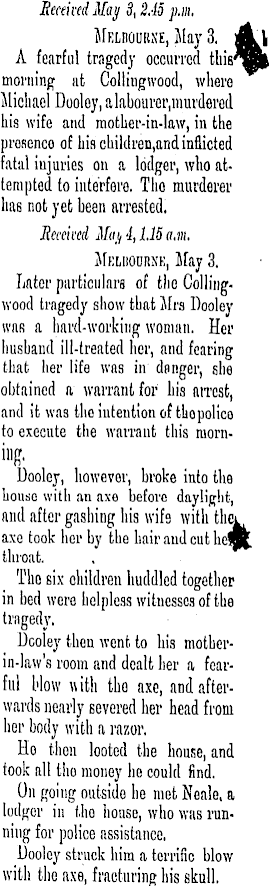 Received May 3,2.45 p.m. Melbourne,May3, Al A fearful tragedy occurred morning at Collingwood, where Michael Dooloy, alabourer.murdered his wife and mother-in-law, in the prosenco of his childi'en,and inflicted fatal injuries on a lodger, who attempted to interfere. Tlio murderer ha 6 not yet been arrested. Mccckcd Mui, 4, LIB a.m. Meliiourxe, May 3. ■ « Later particulars of the Colling, wood tragedy show that Mrs Dooley was a hard-working woman. Her husband ill-treated her, and fearing that her life was in danger, she obtained a warrant for his arrest, and it was tho intention of thopolico to execute the warrant this morniiifr, Dooley, however, broke into the house with an axe before daylight, and after gashing his wife with thei axe took her by the hair and cut heW throat. The six children huddled together in bed were helpless witnesses of the tragedy, Dooley then went to his mother-in-law's room and dealt her a fearful blow with tho axe, and afterwards nearly severed her head from her body with a razor. Ho then looted the house, and took all tho money he could find. On going outside he met Neale, a lodger in tho house, who was running for police assistance, Dooley struck him a terrific blow with the axe, fracturing his skull.