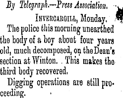 By Telegraph—Press Association. Invercargih, Monday, * The police this morning unearthed tlio body of a boy about four years old, much decomposed, on the Dean's section at Winton.. This makes tho third body recovered, Digging operations are still pro. ceeding. ■
