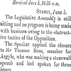 ItemralJiiwo,lo.3s a.m. Sydsev, June 5. The Legislative Assembly is still sitting and no progiess is being made with business owing to the obstructive tactics of tho Opposition. The Speaker applied the closure to Mr Thomas Hose, member for Argyle, who was making a stonewall speech and had spoken for three hours.