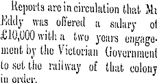 Reports are in circulation that Mr Eddy was offered a salary of £IO,OOO with a two years engagement by the Victorian Government to set the railway of that colony in order.