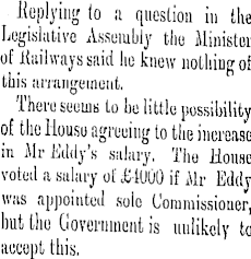 Replying (o a question in the Legislative Assembly the Minister of Ituihvays said he knew nothing of this arrangement. There seems to he little possibility of the House agreeing to the inereaso in Mr Eddy's salary, The House voted a salary of £IUOO if Mr Eddy was appointed solo Commissioner, hut the Government is unlikely to accept this,