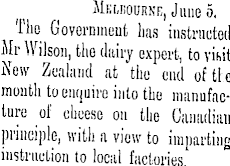 Melbourne, June 5, The Government lias instructod Mr Wilson, the dairy expert, to visit New Zealand at the end of tie month to enquire into the manufacture of cheese on the Canadian principle, with a view to imparting instruction to local factories.
