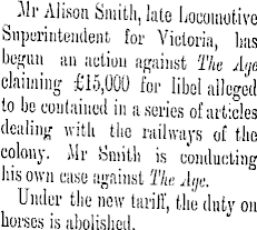 Mr Alison Smith, late Locomotive Superintendent for Victoria, has begun an action against The A<ja claiming £15,000 for libel alleged to be contained in a series of articles dealing with the railways of the colony. Mr Smith is conducting 1 his own case against The Aije. Under the new tin-ill", the duty on horses is abolished.