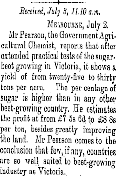 Received, July 3,11.10 a.m. Melkoukke, July 2. Mr Pearson, the Government Agricultural Chemist, reports that after extended practical tests of the sugarbeot growing in Victoria, it shows a yield of from twenty-fivo to thirty tons per acre, The per centage of sugar is higher than in any other beet-growing country. He estimates ! tho profit at from £7 5s 6d to £8 8s per ton, besides greatly improving tho land. Mr Pearson comes to the conclusion that few, if any, countries are so well suited to beet-growing industry as Victoria.