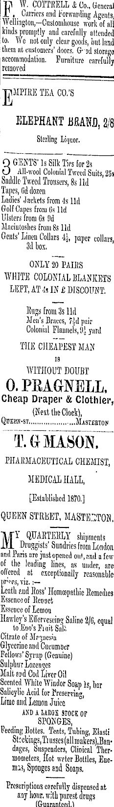 W. COTfIiELL & Co., General Jj , Carriers and I'orwarding Agents,. Wellington,—Cuslomhousc work of all kinds promptly and carefully attended to. We not only clear goods, but land tlicm at customers' doors. G- sd slorago accommodation. Furniture carefully removed jgMPIKE TEA CO.'S ELEPHANT JBRAM), 2/8 Sterling Liquor. Q GENTS' Is Silk Ties for 2s p All-wool Colouial Tweed Suits, 25s Saddle Tweed Trousers, 8s lid Tapes, (id dozen Ladies' Jackets from 4s lid Golf Capes from (is lid Ulsters from Gs [ld Macintoshes from 8s lid Gents' Linen Collars JrJ, paper collars, 3d box. ONLY 20 PAUiS WHITE COLONIAL BLANKETS LEFT, AT 4s IN £ DISCOUNT. lings from 3s lid Men's Braces, 71d pair Colonial Flannels, !)J yard THE CHEAPEST MAN is WITHOUT DOUBT O.PRAGNELL, Cheap Draper & Clothier, (Next the Clock), Qdebn-st Mastebton I\¥MASON. PHARMACEUTICAL CHEMIST, MEDICAL HALL, [Established 1870.] QUEEN STREET, MASTEHTON. MY QUAKTMLY shipments Druggists' Sundries from London imd Paris are just opened out, and a few of the leading lines, as under, are offered at exceptionally reasonable ot'its, viz. Lcatli and Eoss' Homrapathic Kemcdies Essence of Eenoct Essence of Lemon Hawley's Effervescing Salino 2/6, equal to.Eno's Flint Sal', Citrato of Glycerine and Cucumoer Fellows' Syrup (Genuine) Sulphur Lozenges Malt srd Cod Liver Oil Scented. "White Windor Soap Is, bar Sab'cylic Acid for Preserving, time and Lemon Juice AND A LARGE STOCK OF SPONGES, Feeding Bottes. Tents, Tubing, Elasti Stockings, Ti usscs (all makers), Bandages, Suspenders, CliDical Thermometers, Hot wfter Bottles, Enemas, Sponges and Soaps, Prescriptions carefully dispensed at any hour, with purest drugs (Guaranteed.)