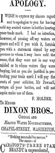 APOLOGY. T WlfiH to express my sincere regret and to apologise to you for having sold my sorated waters iubottles bearing your We mark. I bad no intention, however, o£ passing oft my waters as yours audwill if you wish it, furnish, you with a statement sii?ncd by any persons to whom I may have sold the same, tl,at they were not in any way misled :is to whose waters they were buying, but as you are justified in protecting jour trade mark I will pay tlio costs, of your solicitor, Mr Pownall, return nil your bottles, and will not pgain make use of thorn. F. HOLDER To Messes DIXON BROS., Cordial and Abated Water Maxwactubebs, CHAPEL-STEEET. MASTEIOT. 11 Nothing succeeds l : ka succasj." The succci-. of CAKAFONT'S" THK EE STAR 1)1! ANDY is unpraeedontccl.