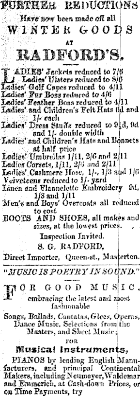 H»w nmr been made aH ail WISTKU GOOC ItADFORD'S T ADXEB' ,f selects reduced to 7/« JLi : Xsdifflf' Ulster* reduced to 8/(5 ESdiea' Golf C»pe« reduced to 4/II X«di««' Fw Boss reduced to 4/6 I Jjadlcs' Feather Boas reduced to 4/11 ILadic* and Children's! Felt Hata lid and ; I/'each X<adif*' Dress SluiTr! reduced to 5) >d, Ort sod 1/-double width Ifttdie" sad Children's Hats nnd U< nnct» .. atlialf price Lsdie*' Umbrellas 1/11,3/G fin'' 2/11 tsadhg Carseti, 1/11, 2fti and 2/11 EiS'llfs'.Cashinerc Ho»e, 1/-, 1/3 nu<l 1/(5 Velveteens reduced to !J• yard Linen and tflannclctto Embroidery Oil, 1/8 and 1/11 n's and " 3fTen's Btid Boys' Overcoats all reduced to cost J30013 AND SHOES, all makes and sizes, at Hie lowest priccsj. , Inspection Invited. S. G. IUDKUJD, Direct Importer, Qitccn-st., M astcrton. 1 -MUSIC IS POJi'J'M Y IX SO I F SDr OH aooi) MUSIC embraciuf,' tl<e latest and liost fashionable Song«, Ballads, Cantatas, Glees, Operas, Dance Music. Selections from the Masters, and Sheet Music; JOR Musical Instruments, PIANOS by leading English Manufacturers, and principal Continental Makers, including ft"oumeyor.Waldcmar snd Emmericli, at Cash-down Prices, or OB Time Payments, try