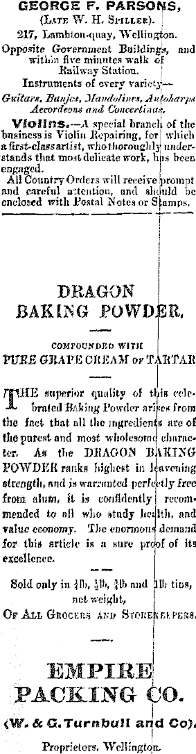 GEORGE F. PARSONS, {L-ITJ: W. H. SMLIER). ! 217, Lambton.<itiay, Wellington. Opposite Government Building, and trltlain five minutes walk ol Bailway Station. j Instruments of every variety— Guitui-x. Eaujes, Hamlolinrs, Autaharfm Atcordeons ami Concertina. Violins.—A special lirancii of the ■businessis Violin Jiopniriiig, for whieh a first-class artist, ivhotliorotialily understands that most delicate work, hiis been engaged. All CottDtryOr(lcr3 will receive and careful attention, and shi enclosed with Postal Notes or S prompt ■u!d be &mps. DRAGON BAKISG POWDJBR, COMI'OUMIKO WITH YXJIUIGJtAFE CfIJiAM of TAKTAB /TUIE (inp«ior quality of thi* celc 'Cri from 9 n« of tiliiirnc--IKJSG -*« brnled Bilking Powder nr\ the fact that nil the ingredient the parent and most -vrholoiornc fcr. As the DIiAGOS B POWDKK rankd highest in ]> writing strength, and in trarrnoted perfectly fee from alufii, it is confidently Blended to all who sttncly Itet Ith. and raluc economy. 'Uie enonnom lot tbiit article is a sure pre of of its excellence Sold only in ill), Jlti, Jlfi and Jlltj tins, net weight, Of Ail Grocers a:;i> H tonzhr.yn:nn, EMPIRE ':.3 PACK.ING €O. <W. & G.TurnfouJl and Co), Proprietors. Wellington.