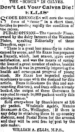 THE "SCOUB" IN CALVES. Don't Let Your Calves Die I BCOUK DRENCHES will care thn worst form ol "Hcanr" in s. short time, fce'ides lirprovin: rapidly the condition of the calves. PDBUCOPISIOS— The <q»jr>nl-r T!mex, owned by the dairy farmers of ihe Waimate Plains, speaking Editorially I of these Urencijß, saye:— i "There is a great loss annuilly in cnWes cancej by ecoar, and Slit Elms has prepared aBnEi'CH, which, last season, (give every satisfaction, and was (be means of aaviDg She lives of a great number of calves, besides tbebstnefit it was in generally improviugt'.'e .health #nd ccmeqaoM progrfij3 of young stock. Mr Ku.ih has imported special Richinery to cope with the detrjand for this article. From iotficitionn (in this and eorronnding district!;), and from om« already bookrd, the octptii of these Uhksciieb fa expt cted to reach lUj(KH) packets weekly this cominjfsc«6-jn." Sola everywhere by StorcMeperg at 1/0 per jacket. Wholesale Agent*, Mkssiis Smblahji & Co., Wellington. |lf '.hpre 1$ anjr delay in obtaining them in up-country 4i«tricts< send Postal Kotea fori the amount : nad they will be sent freo by; post by tho sola maker. WILLIAM A. £LUS, M.P.H.,