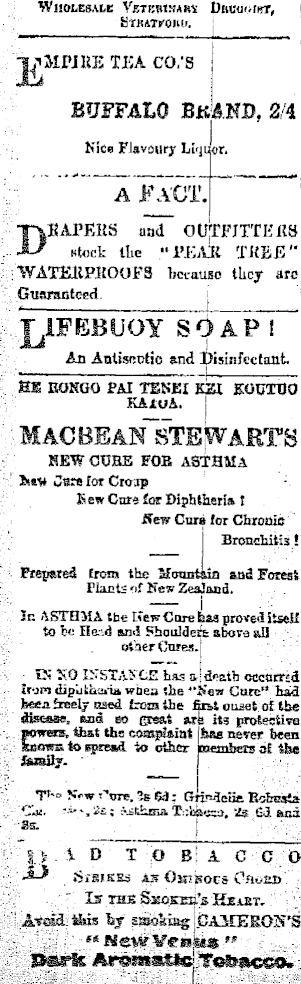WHOLESALE VeTKMHARS URUUi/lnT, tSiHvrroiiu. iMPJKE TEA CO.'S BUFFALO Bk&ND, 2/4 Nice Flavoury Liquor. A FACT. OBAPEKS and OUTFITTEIIB Btock tlie "IVEaIr TitEE" ; WATEREHOOFS Tfct-aUBo thcj- are Guaranteed. An Antiseptic and Disinfectant. HIS BONGO PAI TENEI KZX KOCTOO KAiuA. I HEW CUBE FOB ASTHMA &«v Jare for Cro.jp IS ew Cnr« for Diphtheria t Sew Cure for Chronic I Bronchitis! Prepared from the Mountain and Forest Tlacts of Sew Zcajand. lr. ASTHMA the tiewCore hsa proveditseii to fc« Haid and Shoulders above all oi'aerCnres.t ■ IS KQ INSTANCE hwaJiatboecMrsd Iron dipUtittina whea she "Saw Core" bad feeea!rwly nsed fcorailie " ' ' '" disease, and so raeat a i to spread to other members ol the |J ID TOBACCO ■*-* Si'KFKEs AS OIJ'BOCS Cflufiß IS THE SsSOKEB-'i HjSiBT, A-edS Sris fey sssolsiag CAMERON'S