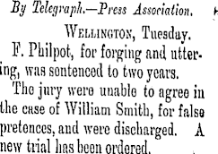 By Telegraph—Press Association, b Wellington, Tuesday. J. Philpot, for forging and uttering, was sontencod to two years. The jury were unable to agree in the case of William Smith, for false pretences, and were discharged. A new trial lias been ordered. ,