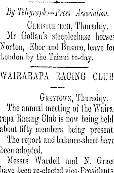 By Telegraph.—Press Association. CiiMSTCiiuiiuii, Thursday. Mr Gollan's steeplechase horses Norton, Ebor and Busaco, leave for Liondon by tlio Tainui to-day. WAIRARAPA RACING CLUB. Greytown, Thursday. The annual meeting of the Wainrapa Racing Club is now being hold, about fifty members being present. The report and balance-sheet have been adopted, Messrs Wardell and N. Grace have been re-elected vice-Presidents.