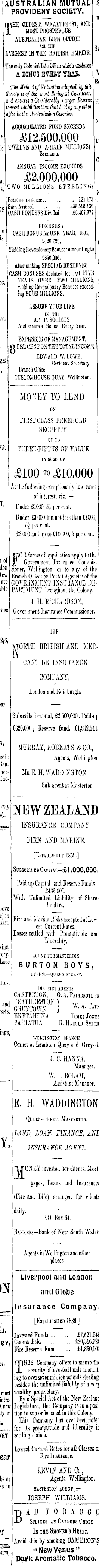 AUSTRALIAN MUTUAL PROVIDENT SOCIETY. The oldest, wealthiest, and MOST PROSPEROUS AUSTRALIAN LIFE OFFICE, AND TIIE LARGEST IN THE BRITISH EMPIRE. The only Colonial Life Oflico which declares A BONUS EVERT TEAR. JVie Moil of Valuation adopted by thif Society is of the most Stringent Character, and ensures a Considerably i.arger iterik to meet Liabilities than that held by any othoi office in the .Utstralatian Colonies. ACCUMULATED FUND EXCEEDS £12.500,000 TWELYE AND A-lIALF MILLIONS) Stem.™. ANNUAL INCOME EXCEEDS £2,000,000 TWO MI LLIONS STERLING POLICIES IN FORCE 121,17 Sum Assured .. .. £30,510,13' CASH BONUSES Divided i(vH>?,37 BONUSES: CASH BONUS lot ONE YEAR, 1891, £•128,020, Yielding llcvcrsionaryliomiscß amounting t £850,000, After making SPECIAL RESERVES CASH BONUSES declared tor last FIV) YEARS, OVEK TWO MILLION! yielding llsversioiwry Bonuses exocci ing FOUR MILLIONS, ASSURE YOUII LIFE IN THE A.M.P. SOCIETY And secure n Bonus Every Year. EXPENSES OF MANAGEMENT, O PER CENT ON THE TOTAL INCOMI EDWARD W. LOWE, Resident SccietMy. Branch ODice— CUSTOMHOUSE QUAY, Wellington. MONEY TO LEND OX FIIIST CLASS FREEHOLD SECUKITY OI'TU THJfEK-FIFTHS OF VALUE IN SI'MS OF £IOO TO £IO,OOO At the following exceptionally low rati of interest, viz. Under £IOOO, 5J per cent. Under £'3,000 lint not less than CIOO o, L per cent, ill,ooo and up to £10,000,5 per cent [7*oll forms of application apply to tl JP Government Insurance Coimni sioner, Wellington, or to any of tl Branch Ollices or Postal Agencies of tl GOVERNMENT INSURANCE J)] PARTMKNT throughout the Colony, ,1. 11. RICHARDSON, Government Insurance Commissioner jjOHTH BRITISH AND MEI CANTILE INSURANCE COMPANY, London and Edinburgh. Subscribed capital, £2,500,000, Paid-i £'620,000; Reserve fund, £'l,B-12,0-l MURRAY, ROBERTS & CO., Agents, Wellinglc Mr E. H.WADDINGTON, Sub-acent at Masterton. NEW ZEALANI INSURANCE COMPANY FIRE AND MARINE, [Established IS3L] Subscribed Capital—£ 1,000,00( Paid up Capital and Reserve Funds £'•135,000. With Unlimited Liability of Shar holders, Fire and Marine Risks accepted atLoi est Current Rates. Losses settled with Promptitude ar Liberality, AGENT FOR MABTF.RTON BURTON BOYS, OFFICE—QUEEN STREET, DISTRICT AGENTS. CARTERTON, G. A. Fairbkotdi FEATHEIiSTON ) w . GREYTOWN ! w ' A ' lA "' EKETAHUNA .TAMES Jon: PAHIATUA G. Harold Smit WELLINGTON IIRAXCH Comer of Lambton Quay and Grey-i J. C. lIANNA, Manager, W. I. BOLAM, Assistant Manager. E. PI, WADDINGTW Queen-street, Masterton. LAND, LOAN, FINANCE, AN INSURANCE AGEN'L invested for clients, Mor gages, Loans and Insurant (Fire and Life) arranged for clien daily. P.O. Box (11. Rankers—Bank of New South Wale Agents in Wellington and other places, Liverpool ana London and Globe Insurance Company [Established 1836.] Invested Funds £7,521,51 Claims Paid £20,316,92 Fiic Reserve Fund ... £1,850,0 C THIS Company offers to insure tl security of in vestedfund s amouir ing to ovcrscvenmillion pounds sterlinj besides the unlimited liability of a ver wealthy proprietary. By a Special Act of the New Zealan Legislature, the Cwnpny is in a pos tion to sue or be sued in this Colony. This Company has ever ken note for its promptitude and liberality i stilling claims, Lowest Current Halts for all Classes c Fire Insurance. WIN AND Co., Agents, Wellington. MABMBTOH AGKfiT }rr JOSEPH WILLIAMS. Bad tobaccc Strikes an Ominous Chord In the Smoker's Heart. Avoid this by smoking CAMERON'S "New Venus" Dark Aromatic Tobacco.