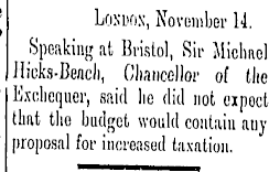 D London, November 14. 0 Speaking at Bristol, Sir Michael Jlicks-BencJi, Chancellor of (lie ■ Exoliequer, said lie did not cxpoct that the budget would contain atiy , proposal for increased taxation. 1 -