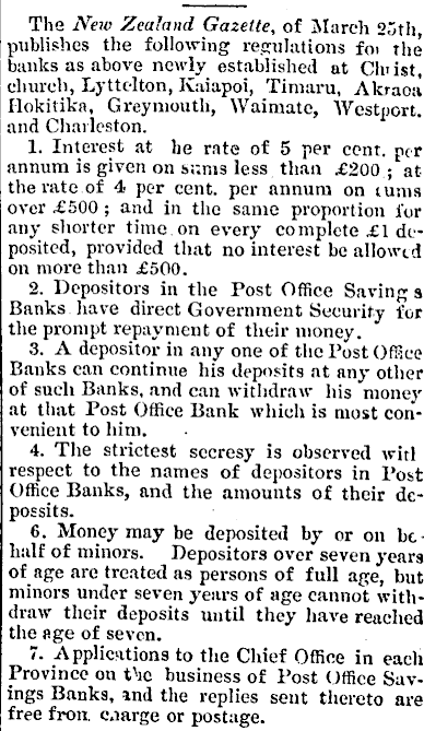 The New Zealand Gazelle, of March 2."th publishes the following regulations foi the banks as above newly established at Christ church, Lyttelton, Kaiapoi, Timaru, Akraoa Hokitika, Greyniouth, Waimate, Westport. and Charleston. 1. Interest at be rate of 5 per cent, per annum is given on sr.ms less than .£2OO ; at the rate of 4 per cent, per annum on turns over £SOO ; and in the same proportion for any shorter time on every complete £1 deposited, provided that no interest be allowed on more than £SOO. 2. Depositors in the Post Office Saving s Banks have direct Government Security for the prompt repayment of their money. 3. A depositor in any one of the Post Office Banks can continue his deposits at any other of such Banks, and can withdraw his money at that Post Office Bank which is most convenient to him. 4. The strictest sccresy is observed witl respect to the names of depositors in Po*t Office Banks, and the amounts of their dcpossits. 6. Money may be deposited by or on be half of minors. Depositors over seven years of age arc treated as persons of full age, but minors under seven years of age cannot withdraw their deposits until they have reached the age of seven. 7. Applications to the Chief Office in each Province on business of Post Office Savings Banks, md the replies sent thereto are free fron cjarge or postage.