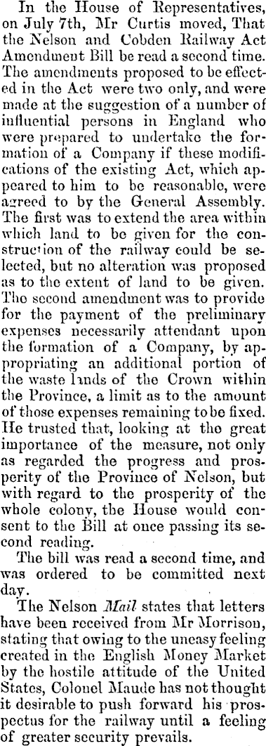 In the House of Representatives, on July 7th, Mr Curtis moved, That the Nelson and Cobden Railway Act Amendment Bill be read a second time. The amendments proposed to be effected in the Act were two only, and were made at the suggestion of a number of influential persons in England who were prepared to undertake the formation of a Company if these modifications of the existing Act, which appeared to him to be reasonable, wore agreed to by the General Assembly. The first was to extend the area within which land to be given for the construe ion of the railway could be selected, but no alteration was proposed as to the extent of land to be given. Tho second amendment was to provide for the payment of the preliminary expenses necessarily attendant upon the formation of a Company, by appropriating an additional portion of the waste lands of the Crown within the Province, a limit as to the amount of those expenses remaining to be fixed. He trusted that, looking at the great importance of the measure, not only as regarded the progress and prosperity of the Province of Nelson, but with regard to the prosperity of the whole colony, the House would consent to the Bill at once passing its second reading. The bill was read a second time, and was ordered to be committed next day. The Nelson Mail states that letters have been received from Mr Morrison, stating that owing to the uneasy feeling created in the English Money Market by the hostile attitude of the United States, Colonel Maude has not thought it desirable to push forward his prospectus for the railway until a feeling of greater security prevails.